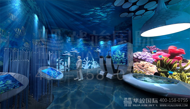 通過3D投影、多屏觸控、光纖燈等現代科技手法,呈現魚類、珊瑚等豐富多彩的海洋場景。設置“深海巡游”體驗展項,參觀者可通過坐上特制設備,身臨其境遨游海洋深處。整個空間相對封閉,全方位營造“海”之意境。